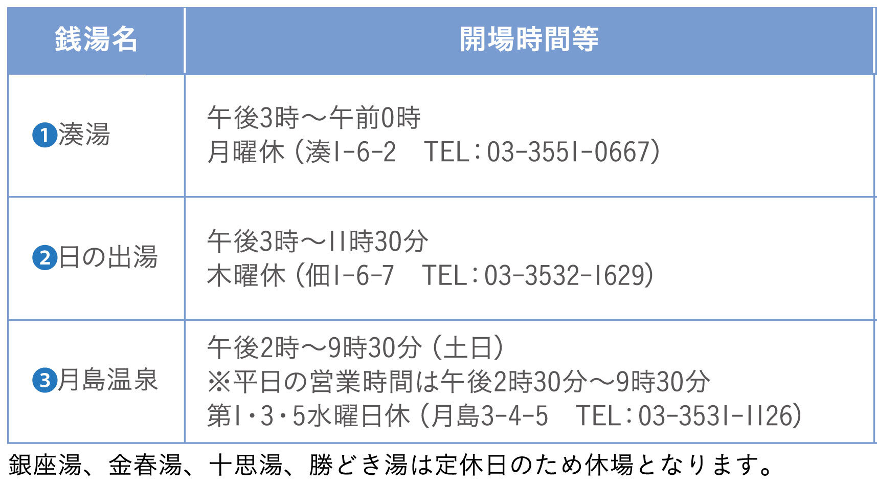 ※各銭湯の詳しい情報は、中央浴場組合ウェブサイト(http://www.268chuou.com/) でご確認ください。